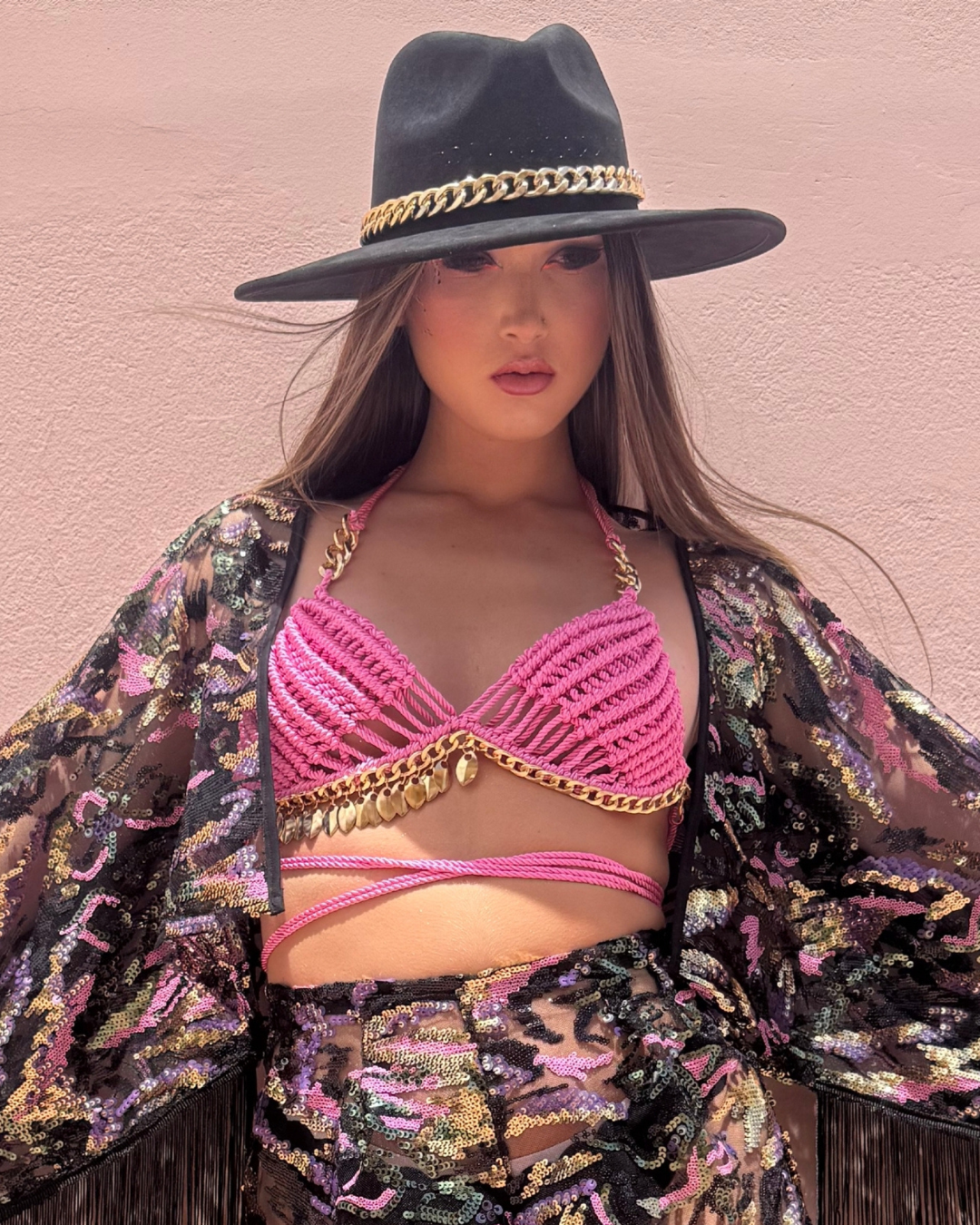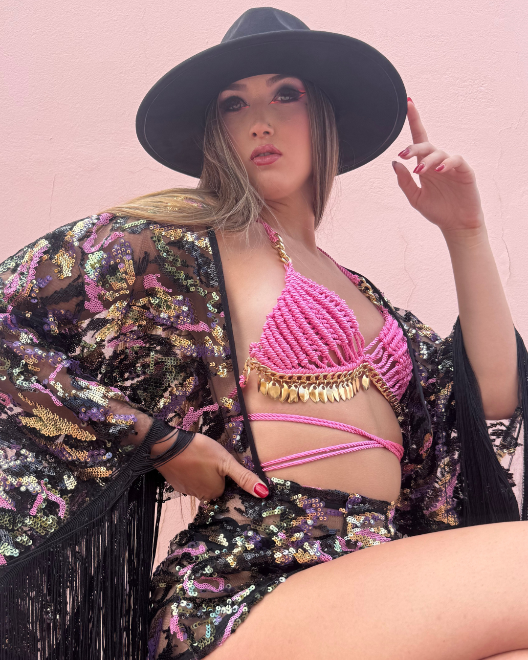 Top realizado con la técnica macramé con escamas doradas, cadena de acero cosida a mano  y doble cordón de cierre cintura. Realizado íntegramente de manera artesanal.